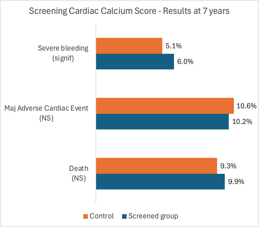 A randomized study published in the European Heart Journal invited Danish men ages 60–64 to undergo CT cardiac screening. After seven years, there was no significant mortality benefit in the population invited to the screening.