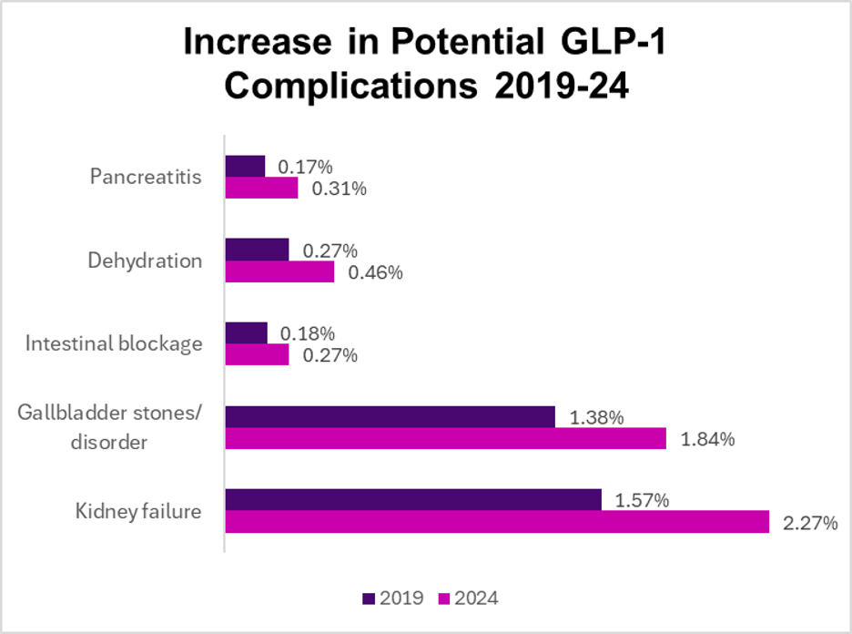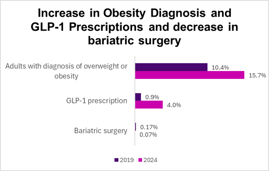 Fair Health reported that in 2024, 40% fewer people had bariatric surgery compared to 2019. Few of those who had bariatric surgery were prescribed GLP-1s afterward (rounded to 0%).