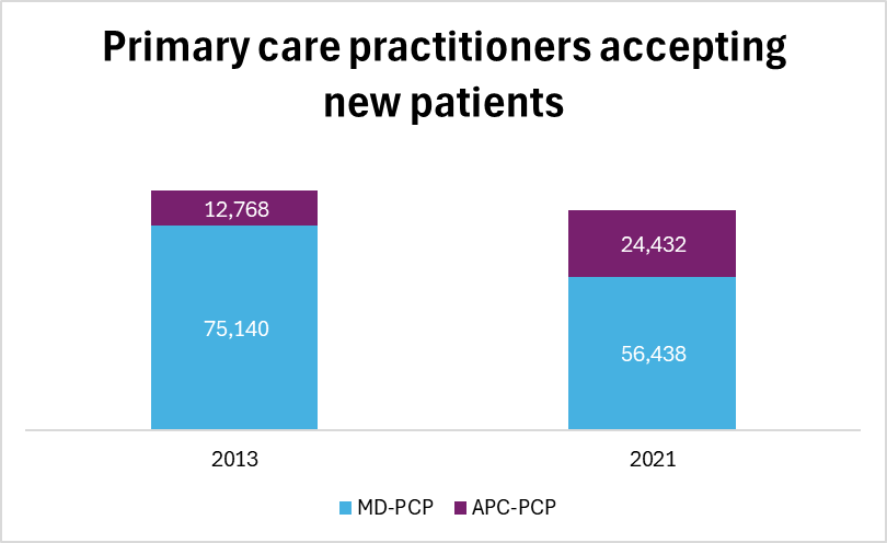 Source: Morgan KM, et al Primary Care Clinicians Available for New Patient Visits. JAMA Intern Med. January 20, 2026; MD-PCP are physician Primary Care Physicians; APC-PCP are Advanced Practice Clinician PCPs such as nurse practitioners or physician assistants.
