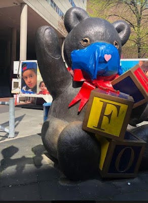My daughter is a senior pediatric resident at Tufts Medical Center's Floating Hospital for Children. The pediatric ICU has been turned into an adult COVID unit; there are few kids in the hospital now, and the ICU beds are needed for sick adults. This is a photo from the statue in front of the public entrance.