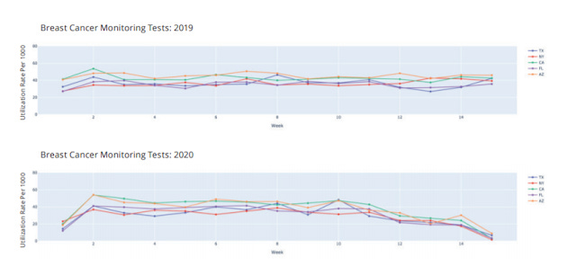 There's similar data from Komodo Health. Pap smears, lipid testing, and Hemoglobin A1C tests (for diabetes) are all down by two thirds. Here's their data on decreased monitoring tests for breast cancer - also showing a pretty dramatic decline.