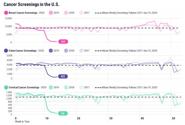 Here's a graphic from the medical record company EPIC showing that mammography, colonoscopy, and pap smears have cratered, going down by 94%, 86%,and 94% respectively