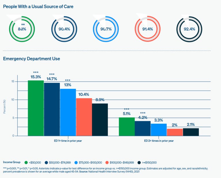 The graphic above shows that people earning under $50,000 annually were least likely to have a regular source of care (upper donut graphics) and were most likely to visit the emergency department. Those who earned under $50,000 were 2.4 times more likely to have two or more emergency department visits than those with income of over $150,000.