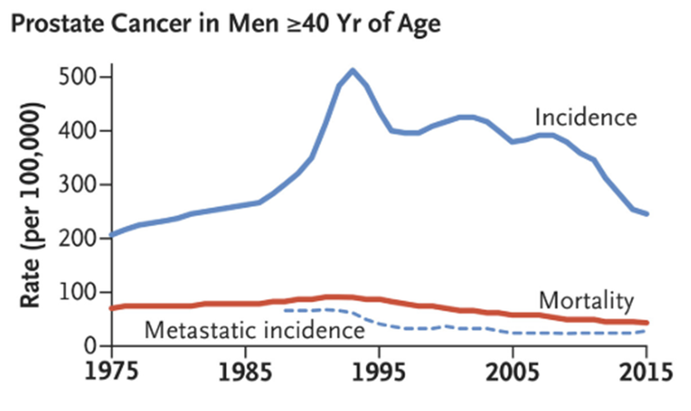 Source: Welch, et al NEJM 2019. Widespread PSA screening for prostate cancer began in 1986- just before the peak of incidence. Note that fewer cases of metastatic disease were found, and mortality from prostate cancer declined modestly.