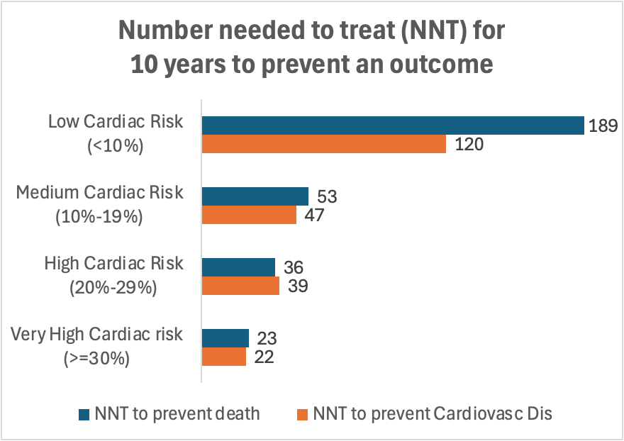 The NNT illustrates that many more low-risk individuals must be treated to prevent an adverse outcome compared with treating higher-risk patients.