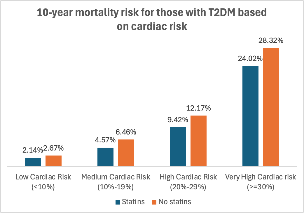 Vincent Ka Chun Yan, Joseph Edgar Blais, John-Michael Gamble, et al. Effectiveness and Safety of Statins in Type 2 Diabetes According to Baseline Cardiovascular Risk: A Target Trial Emulation Study. Ann Intern Med. December 30, 2025. Risk expressed as risk of a cardiovascular event in the following ten years.