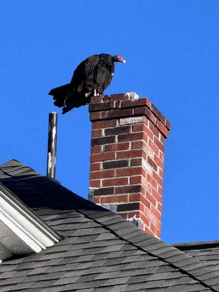 This is a turkey vulture on a chimney in Carlisle, MA in late August on my usual bike route.