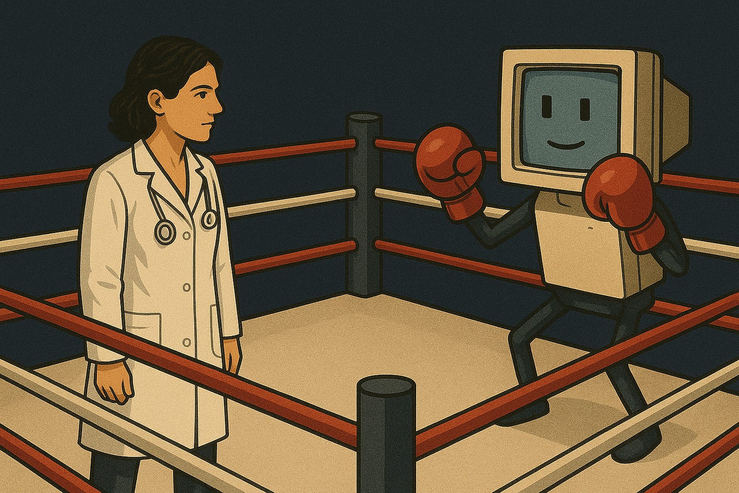 Image created with ChatGPT. My prompts to put the physician and anthropomorphized computer in the opposite corners were unsuccessful.
